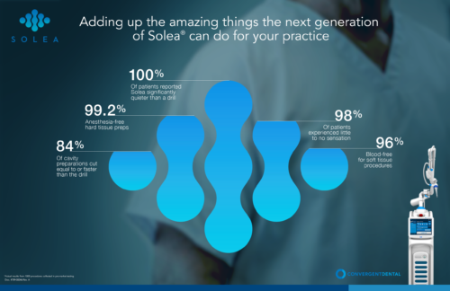 - The Next Generation of Solea® by Convergent Dental, Inc.: The new, smaller Solea cuts faster, smoother and 99.2% anesthesia free and features enhanced software and improved remote access with a 4G LTE mobile data connection. The industry-leading CO2 all-tissue dental laser, Solea, earned its reputation for enabling dramatic practice growth and reduced stress for dentists and patients by taking anesthesia, bleeding, sutures, and discomfort out of the dental experience. Its latest advancements provide unprecedented clinical performance, significant software upgrades, improved ergonomics, increased accessibility and a smaller footprint (15% slimmer). Before launch of this platform, Solea dentists reported doing four to six more procedures per day while feeling like they were doing less work. Now they can expect all those benefits with enhanced ergonomics — a lighter, more maneuverable handpiece with improved rotation and a wider range of motion.Benco Dental will feature these five insightful solutions, alongside leading-edge services, equipment and merchandise at the Greater New York Dental Meeting, through November 28, at Booth 1617. For more information, visit benco.com or call 1.800.GO.BENCO.