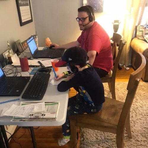 Matt Burroughs, a Success Partner Representative II in the Benco Dental Contact Center, is shown with his son, Patrick, on “Bring Your Child to Work Day” as they both work from home.