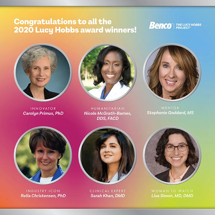 Lucy Hobbs Project_2020 Honorees.jpg: Named for the first American female to earn a dental degree, the Lucy Hobbs Project, powered by Benco Dental, annually presents six awards to inspirational women in the profession. The 2020 honorees include: Rella Christensen, PhD, Industry Icon Award, Sarah Khan, DMD, Clinical Expert Award, Nicole McGrath-Barnes, DDS, FACD, Humanitarian Award, Carolyn Primus, PhD, Innovator Award, Stephenie Goddard, MS, Mentor Award, and Lisa Simon, MD, DMD, Woman to Watch Award.